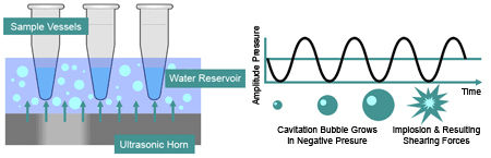 DAS™ produces acoustic energy in a shallow amount of water, which creates millions of cavitation bubbles. cavitation bubbles implode after reaching sufficient size, intense shock waves are transmitted into vessels containing samples