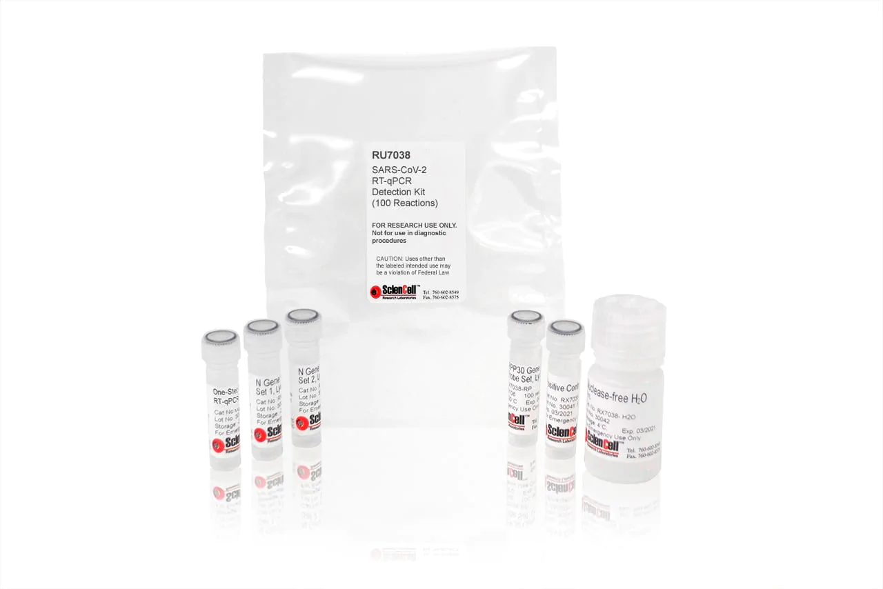 ScienCell's SARS-CoV-2 RT-qPCR Detection Kit (SCVPD) is designed to detect the presence of SARS-CoV-2 Coronavirus in respiratory specimens and serum samples following CDC guidelines (see Appendix 1). One-step TaqProbe RT-qPCR master mix is conveniently included in the kit. Please read carefully and follow these guidelines for biosafety precautions when dealing with possible infectious samples and for obtaining quality data. Included in the kit are two primer/probe sets (Cat #7038-N1 and 7038-N2) that target coronavirus SARS-CoV-2 nucleocapsid (N) gene, and the Human RPP30 gene primer/probe set (Cat #7038-RP) that targets exon 1 of human RPP30 gene and serves as a control to assess specimen quality. In addition, a non-infectious positive control (Cat #7038-Pos) and nuclease-free water are included in the kit. The positive control (Cat #7038-Pos) consists of non-infectious viral RNA fragments spiked into human small airway epithelial cells and serves to ensure reagents and instruments are working properly. Please refer to Tables 4 and 5 for results interpretation.