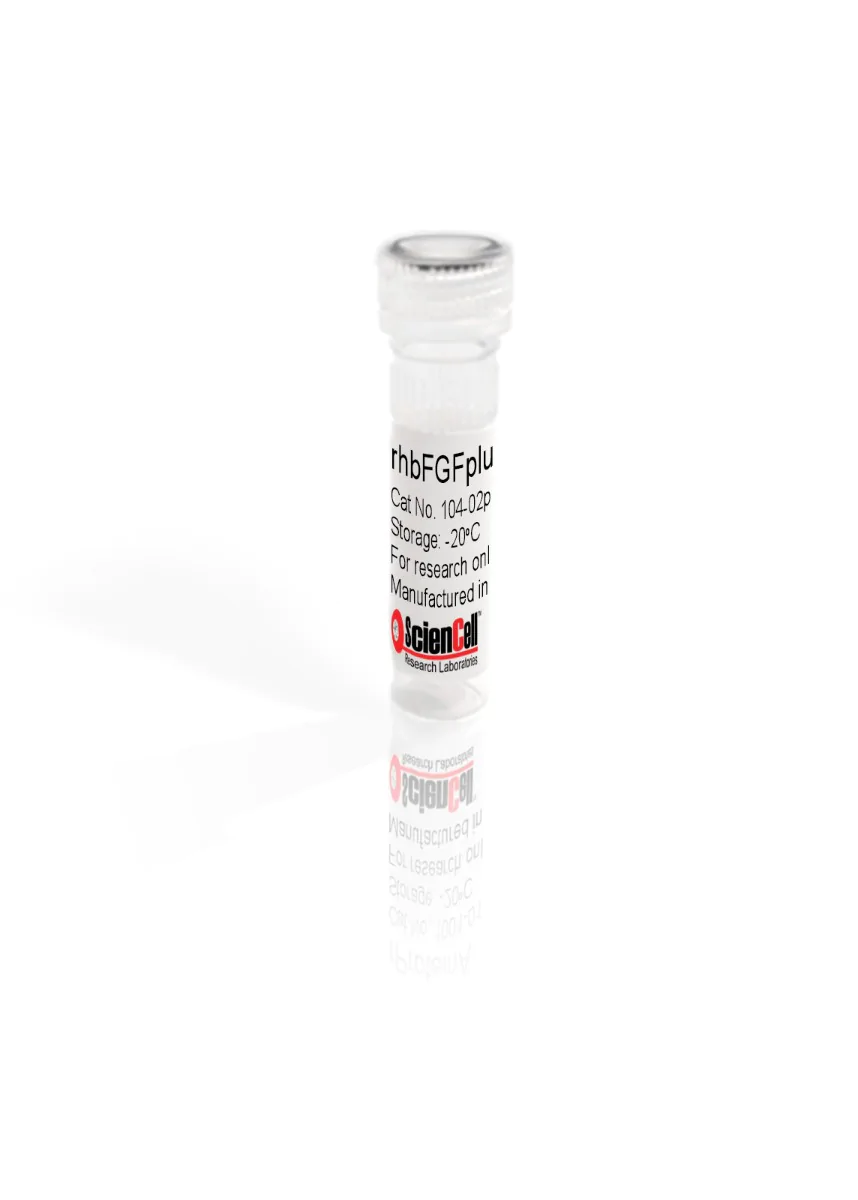 Basic Fibroblast Growth Factor (bFGF) is a member of the FGF family of mitogenic peptides. bFGF is extremely efficient at inducing DNA synthesis in a variety of cell types from mesoderm and neuroectoderm lineages. Use of native bFGF in cell biology however, is limited by the fact that bFGF rapidly degrades at physiological temperatures. ScienCell's Recombinant Human Basic Fibroblast Growth Factor Plus is engineered for greater stability, which increases cell proliferation compare to native bFGF. The rhbFGFplus shares more than 97% amino acid identity with the 155-amino-acid human bFGF and leaves heparin and the FGF receptor binding sites unmodified. Synonyms: FGF-2, HBGF-2, Prostatropin, Fibroblast Growth Factor-basic (FGFb). AA Sequence: > 97% sequence homology to native human bFGF. Source: Escherichia coli. Molecular Weight: 17.1 kDa, a single non-glycosylated polypeptide chain containing 155 amino acids. Purity: > 95%. Physical Appearance: White lyophilized powder. Endotoxin: <0.1 ng/ug of protein (<1 EU/ug). Biological Activity: Biological activity fully tested using Human umbilical vein endothelial cells (HUVECs). Formulation - Lyophilized from a 0.2um filtered concentrated (1mg/ml) solution in PBS, pH 7.4. Reconstitution -Reconstitute in sterile distilled water containing 0.1% BSA to a concentration of 0.1-1.0 mg/mL.