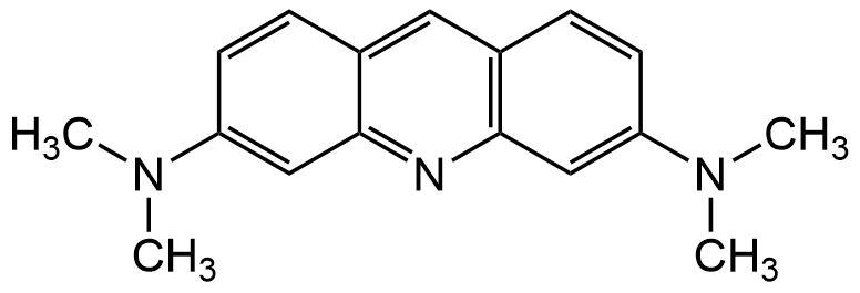 Chemical. CAS: 494-38-2. Formula: C17H19N3. MW: 265.35. Acridine Orange Base is a metachromatic fluorescent dye that stains DNA and RNA. It is only slightly soluble compared to its HCL salt form. It is used as a nucleic acid-selective fluorescent cationic dye useful for cell cycle determination and staining dead cells. Being cell-permeable, it interacts with DNA and RNA by intercalation or electrostatic attractions respectively. When bound to DNA, it is very similar spectrally to fluorescein, with an excitation maximum at 502nm and an emission maximum at 525nm (green). When acridine orange associates with RNA or ssDNA, the excitation maximum shifts to 460nm (blue), and the emission maximum shifts to 650nm (red). Acridine orange will also enter acidic compartments such as lysosomes where it becomes protonated and sequestered. At low pH (inside the organelles), it will emit an orange fluorescence (peak at 590nm) and for optimal endosome visualization a blue light excitation (475nm) is used. Thus, acridine orange can be used to visualize primary lysosomes and phagolysosomes that may include products of phagocytosis of apoptotic cells. The dye is often used in epifluorescence microscopy and flow cytometry. It allows for visual detection of nucleic acids on agarose and polyacrylamide gels, can be used for differentiation of dsDNA (green fluorescence) and ssDNA/RNA (red fluorescence) and as a vitality test for determination of living cells. Spectral data: lambdaEx=502nm, lambdaEm=525nm (green, double strands) / lambdaEx=460nm, lambdaEm=650nm (red, single strands) / lambdaEx=475nm, lambdaEm=590nm (orange, acidic conditions).