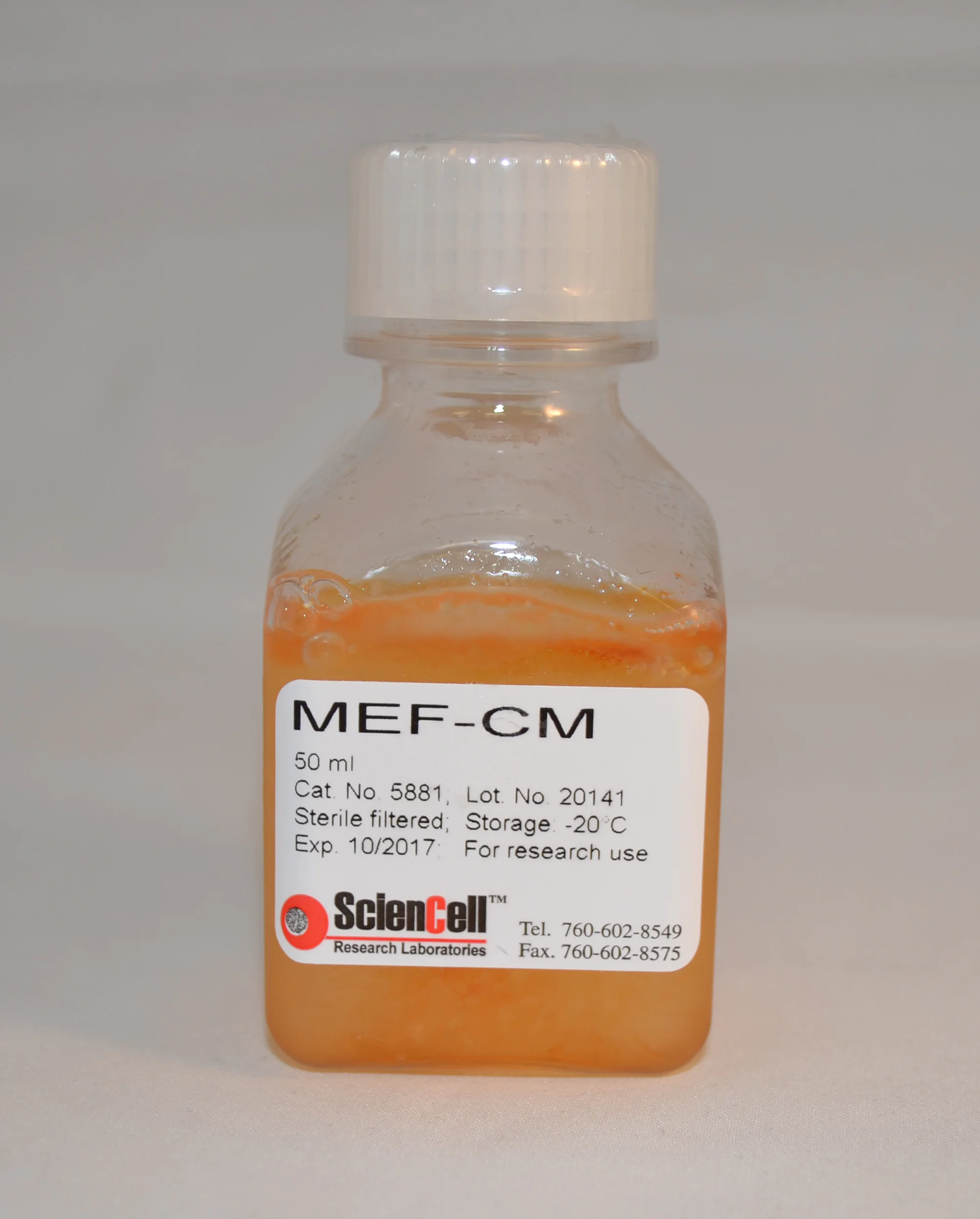 Mouse Embryonic Fibroblast-Conditioned Medium (MEF-cm) is a serum free medium for the feeder independent culture of human pluripotent stem cells (hPSCs), including embryonic stem cells and induced pluripotent stem cells. MEF-cm is an efficient alternative to MEF feeder cells, supporting the self-renewal of hPSC and maintaining pluripotency in the presence of basic FGF and hPSC qualified matrix (e.g., BD MatrigelTM matrix). ScienCell's MEF-cm was prepared using high quality mitomycin C treated MEF (MEF-mt, Cat. #M7570-mt) derived from E13 embryos of CF1 mice. Serum free medium was conditioned with mitomycin C treated CF1 MEFs for 24 hours. The conditioned medium was collected daily for 7 days, pooled and sterilized by filtering through a 0.22 um filter. Before using MEF-cm for hPSC culture, please add fresh recombinant human basic FGF (4 ng/mL) (rhbFGF, Cat #104-02) into the medium to make the complete medium. The complete MEF-cm has been tested for its ability to support hPSC self-renewal on BD MatrigelTM matrix in vitro. The medium color of each lot may vary but does not affect performance.